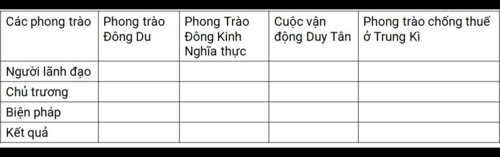 Làm giúp mình vs mình đang cần gấp Lập bảng thống kê về các phong trào Tiêu biểu như bảng ở nàyCác phong trào Phong trào Đông Du Phong Trào Đông Kinh Nghĩa thự