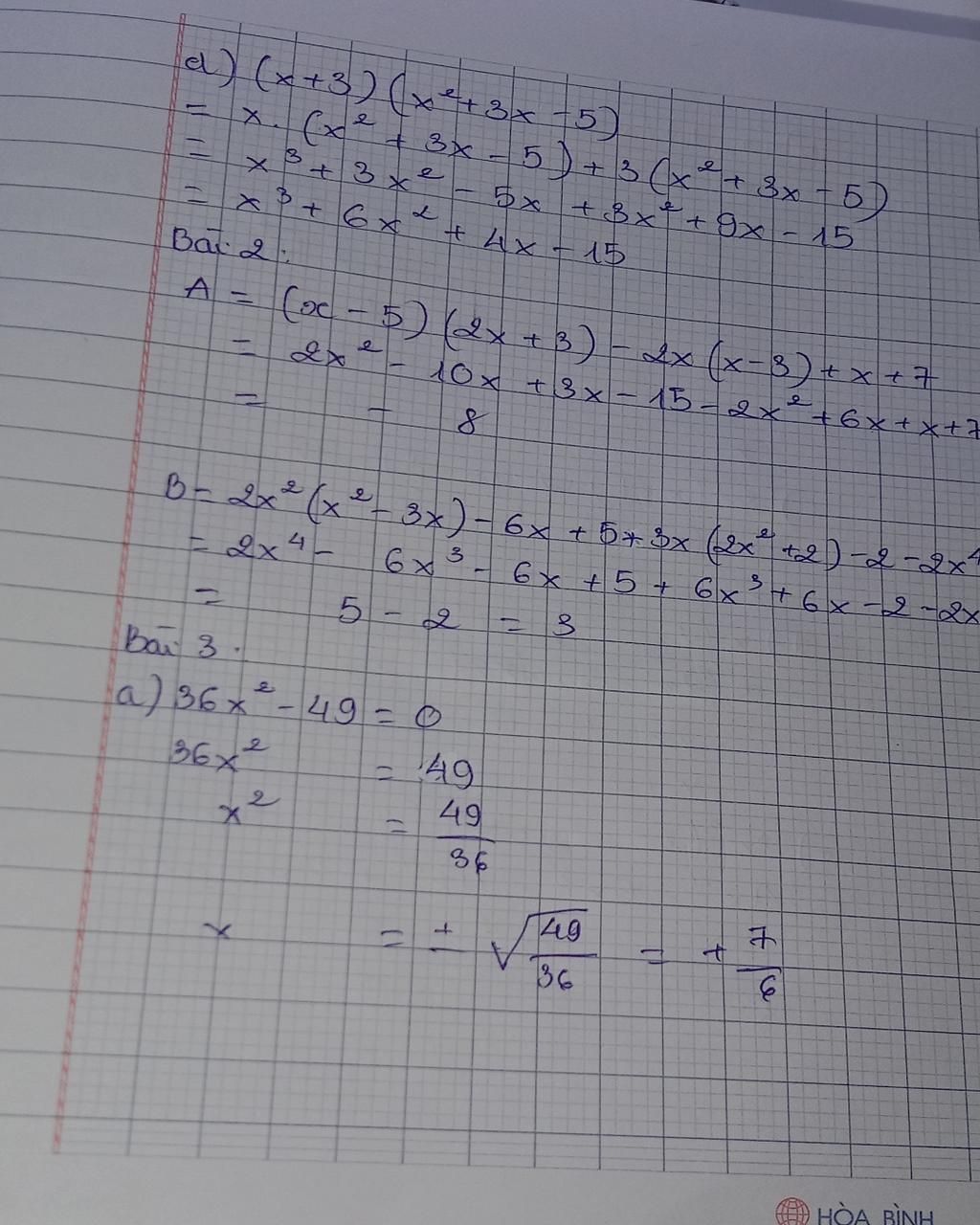 b) (x – 2)(x2 + 3x – 4) d) (x + 3)(x2 + 3х- 5) Bài 2: Chứng tỏ các biểu thức sau không phụ thuộc vào giá trị của biến: Bài 1: Tính a) (-2x).(3x² – 2x + 4)