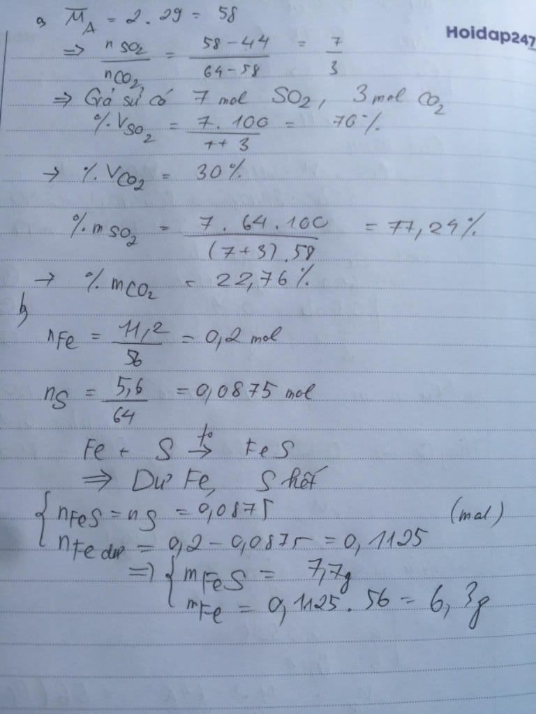 a) Hỗn hợp A gồm SO2 và CO2 có tỷ khối hơi đối với không khí là 2. Tính % về thể tích và khối lượng mỗi khí trong hỗn hợp đó. b) Trộn 11.2 g Fe với 5,6 g lưu h