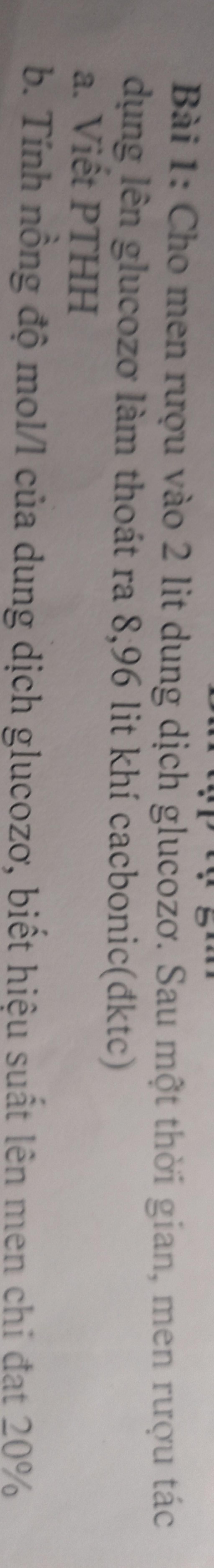 \(\begin{array} {l} a)\\ C_6H_{12}O_6\xrightarrow[\rm men\,rượu]{30-32^oC}2C_2H_5OH+2CO_2\\ b)\\ n_{CO_2(tt)}=\dfrac{8,96}{22,4}=0,4(mol)\\ \to n_{CO_2(lt)}=\dfrac{0,4}{20\%}=2(mol)\\ \text{Theo PT: }n_{C_6H_{12}O_6(lt)}=\dfrac{1}{2}n_{CO_2(lt)}=1(mol)\\ \to C_{M\,C_6H_{12}O_6}=\dfrac{1}{2}=0,5M \end{array}\)