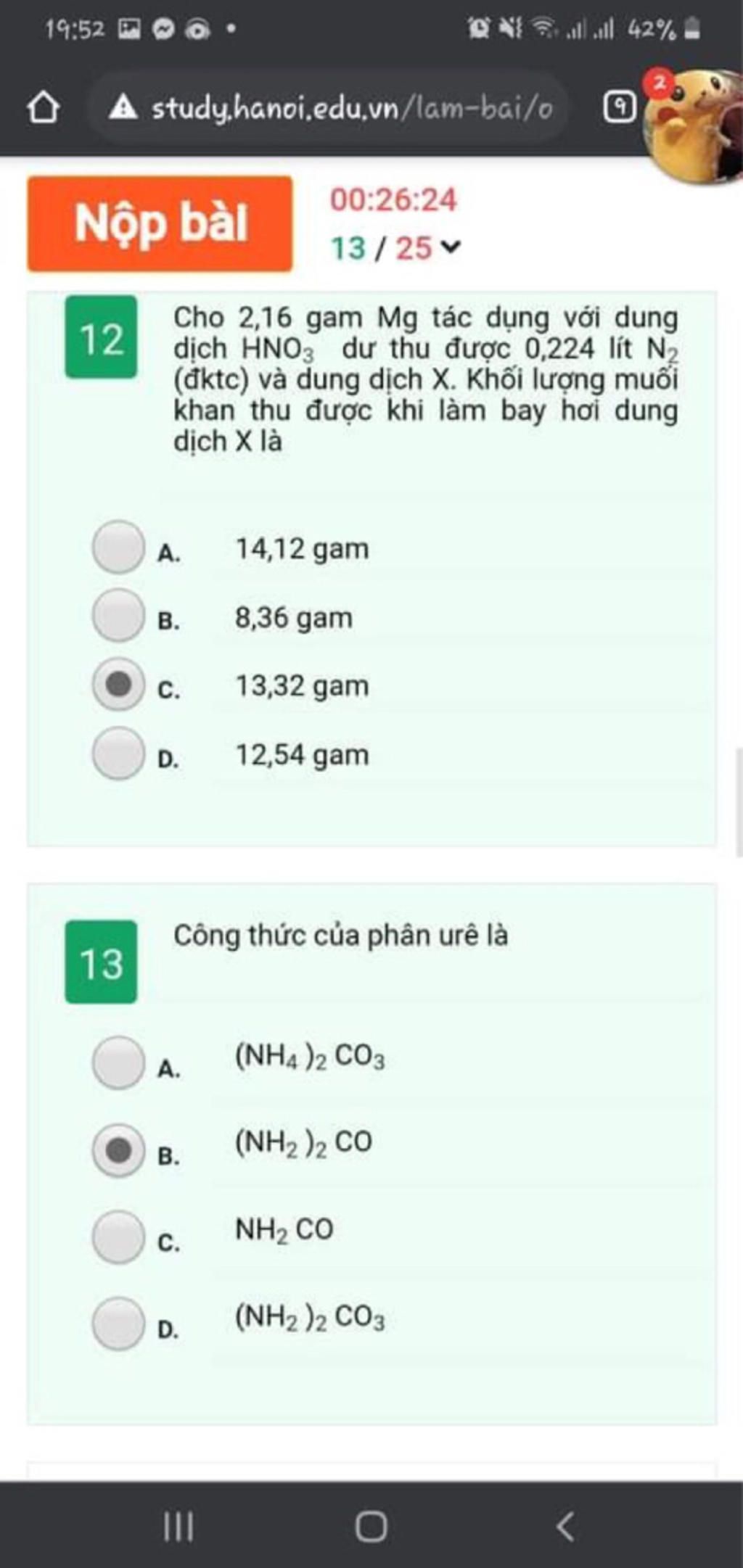 19:52 O NI all all 42% A study.hanoi,edu,vn/lam-bai/o 00:26:24 Nộp bài 13/ 25 v Cho 2,16 gam Mg tác dụng với dung 12 dịch HNO3 du thu được 0,224 lít N2 (đk