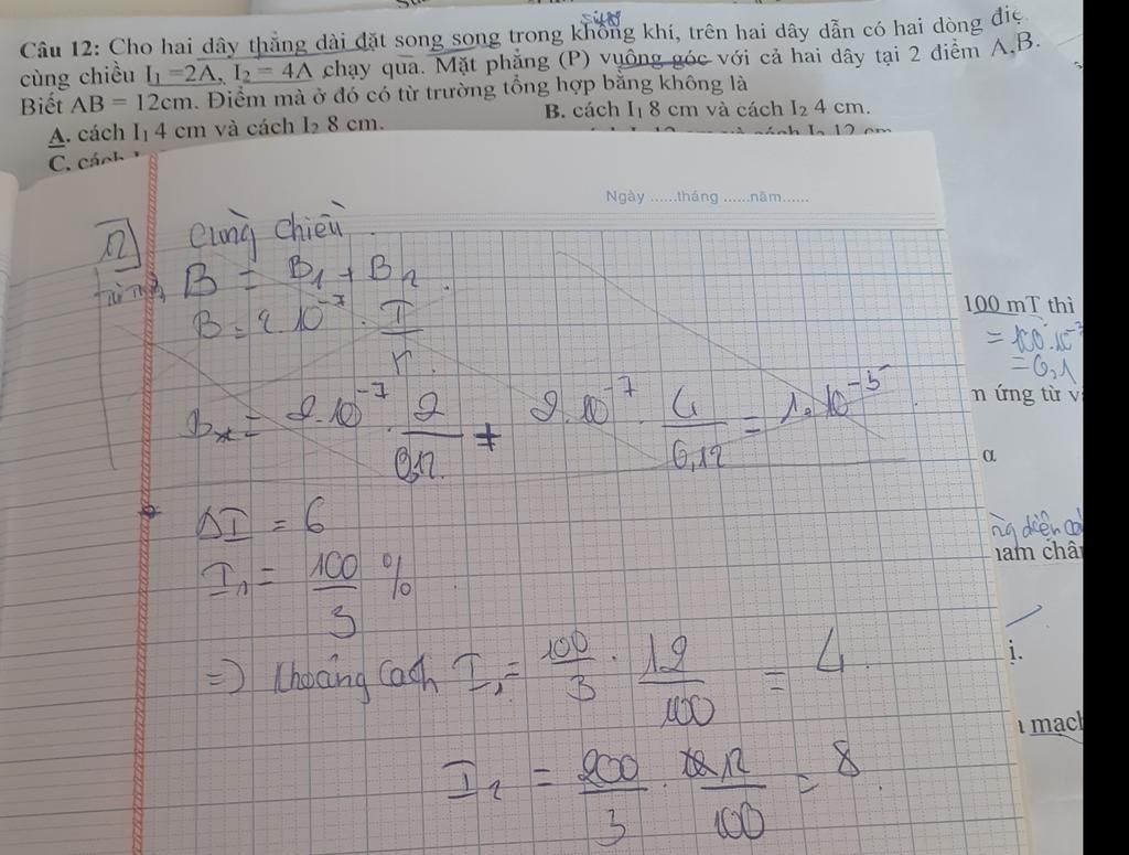 Vì 2 dòng điện cùng chiều nên để B triệt tiêu thì M nằm giữa 2 dây dẫn.