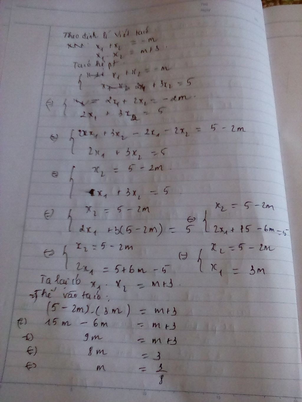 $\left \{ {{x1 + x2 = -m} \atop {2.x1 + 3.x2 = 5}} \right.$ Giải ra ta được: $\left \{ {{x1=-3m-5} \atop {x2=2m+5}} \right.$