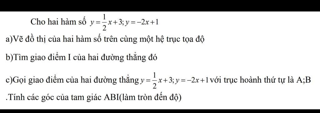 Cho hai hàm số y=;x+3;y =-2 1 x+3; y = -2x+1 a)Vẽ đồ thị của hai hàm số trên cùng một hệ trục tọa độ b)Tìm giao điểm I của hai đường thẳng đó c)Gọi giao đi