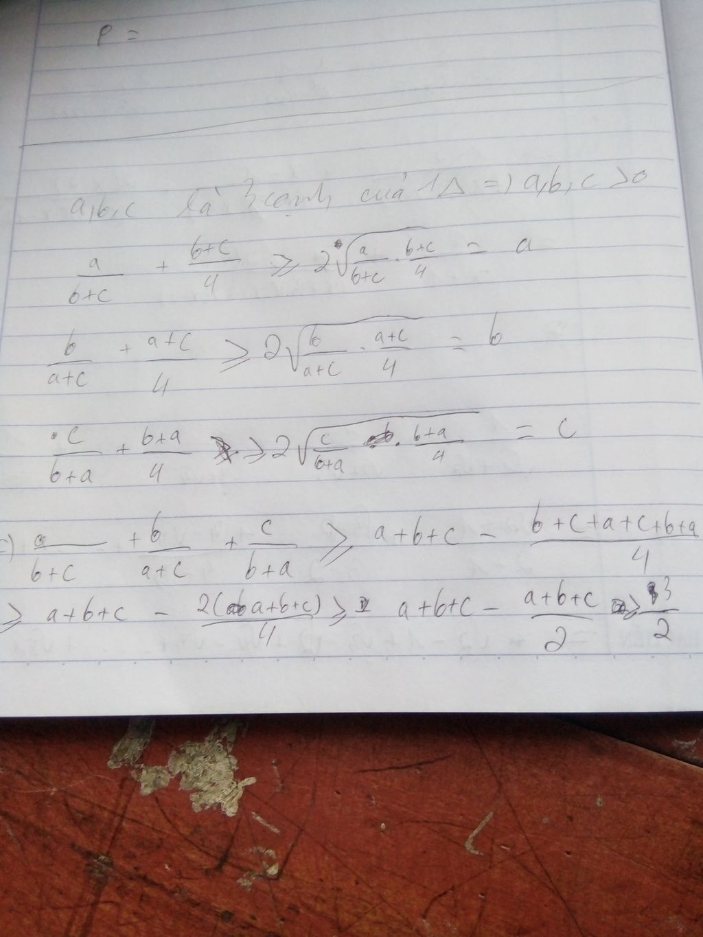 bất đẳng thức tương đương với : $\frac{y+z-x}{2x}$ +$\frac{z+x-y}{2y}$ +$\frac{x+y-z}{2z}$ $\geq$ $\frac{3}{2}$