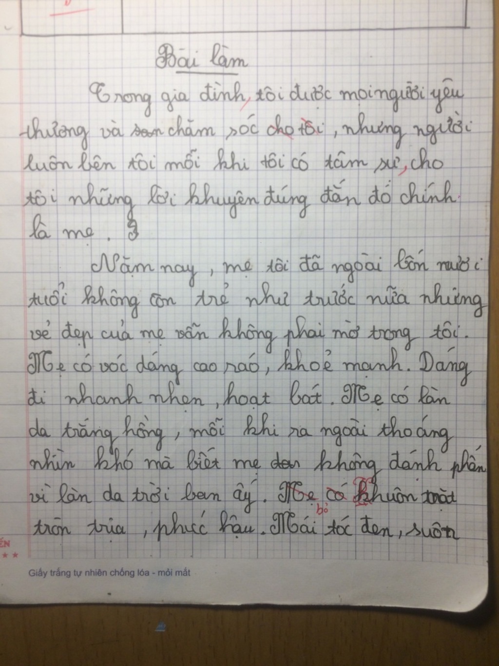 Là một giáo viên mẫu mực, nhưng mẹ vẫn là một người nội trợ, người mẹ, người vợ, người con mà gia đình tôi vô cùng trân trọng. Bận bịu ở trường nhưng chưa bao giờ mẹ quên bố con tôi. Mọi việc từ những điều nhỏ nhặt nhất trong cuộc sống của tôi đều nhờ đôi bàn tay mẹ. Mẹ hiền lành, tốt bụng, hàng xóm láng giềng ai cũng yêu cũng quý. Mẹ cũng chính là người đã nuôi tôi khôn lớn, dạy tôi tập nói, bước đi, cầm tay tôi viết những nét chữ đầu tiên và dạy tôi những bài học làm người quý giá. Mẹ đạt được danh hiệu giáo viên giỏi nhiều năm và cũng giữ vị trí số một trong trái tim bố con tôi.