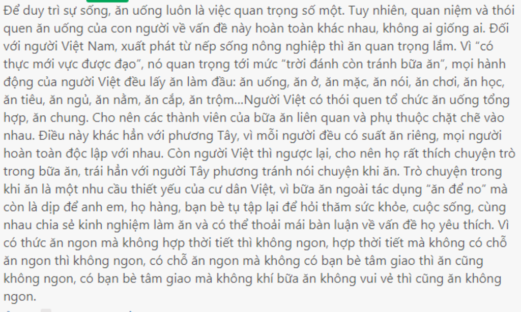Mẹ tôi thường kể chuyện này với anh chị em chúng tôi rằng: “Bà nội của chúng con rất khôn khéo trong việc hướng dẫn cho các cô chú là em của bố con đó. Mỗi lần có khách từ phương xa tới thăm nhà mà được mời ăn cơm chung với gia đình, thì bà chỉ việc ra dấu hiệu bằng con mắt – chứ không phải dùng lời nói – là các cô chú hiểu ngay để mà ngưng không lấy thêm cơm cho mình ăn nữa. Và dĩ nhiên là phần cơm còn lại ở trong nồi thì chủ y dành riêng để người khách có thể ăn cho thỏai mái…”