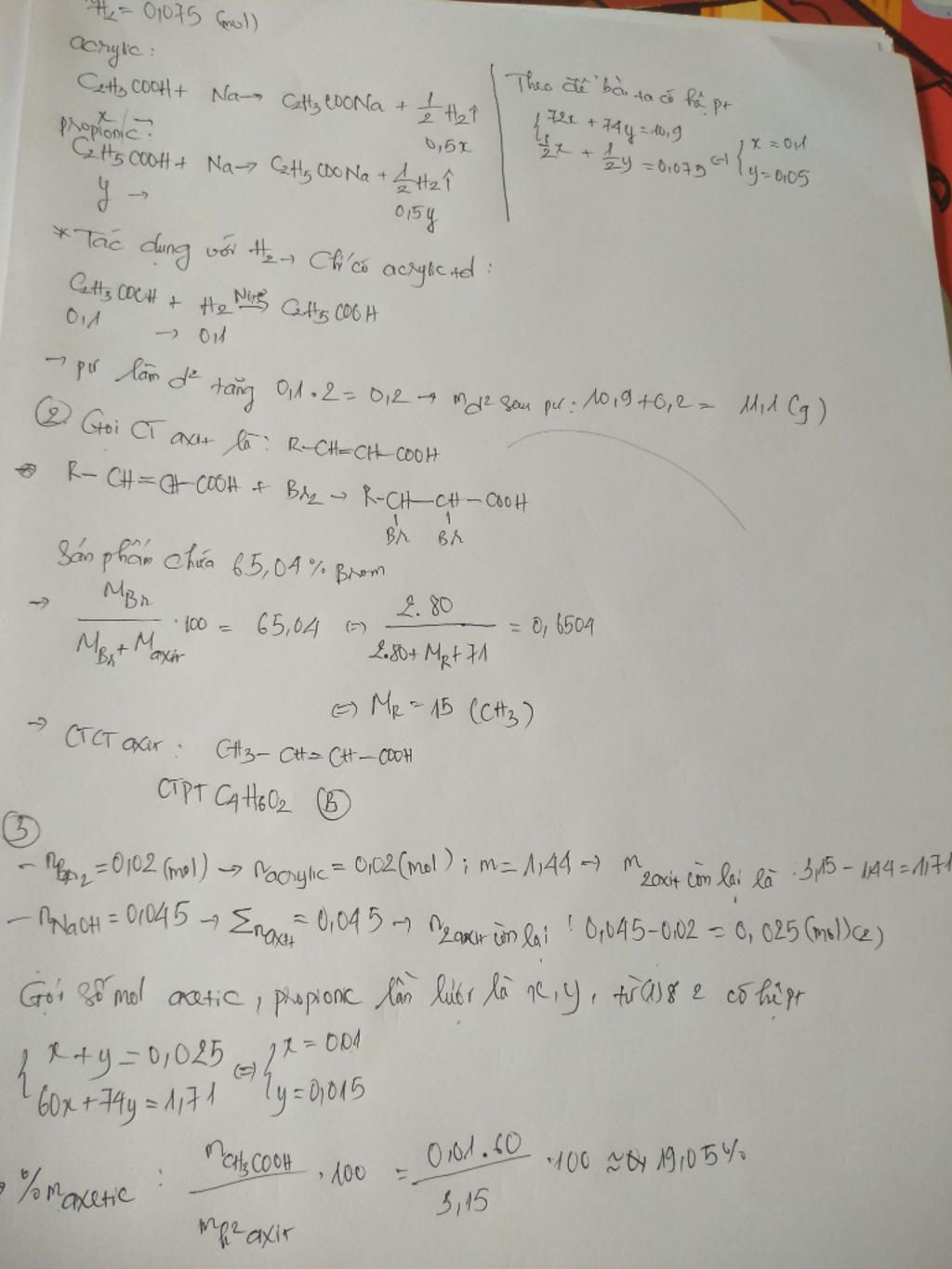 Bài 1: Cho 10,90 gam hôn hợp gồm axit acrylic và axit propionic phản ứng hoàn toàn với Na thoát ra 1,68 lít khí (đktc). Nếu cho hỗn hợp trên tham gia phản