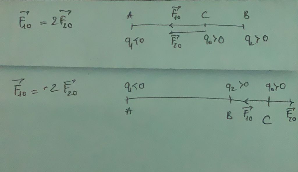\[{F_{10}} = k.\frac{{\left| {{q_1}{q_0}} \right|}}{{A{C^2}}};{F_{20}} = k.\frac{{\left| {{q_2}{q_0}} \right|}}{{B{C^2}}}\]
