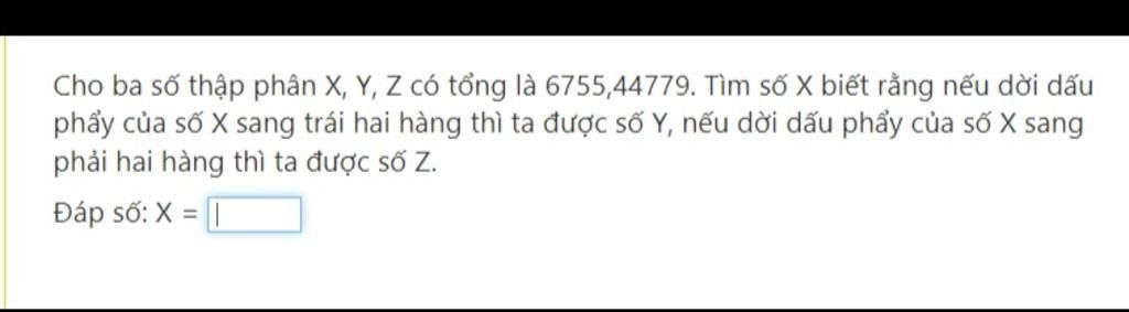 Theo bài ra ta có nếu rời dấu phẩy của số thập phân X sang trái 2 số thì sẽ được số Y, nếu rời dấu phẩy của số thập phân X sang phải 2 số thì sẽ được số Z