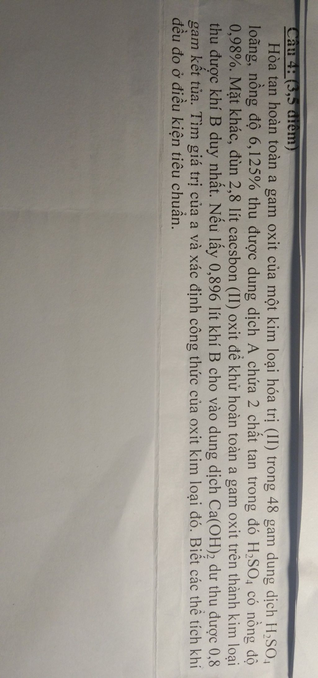 Câu 4: (3,5 điem) Hòa tan hoàn toàn a gam oxit của một kim loại hóa trị (II) trong 48 gam dung dịch H,SO, loãng, nông độ 6,125% thu được dung dịch A chứa 2