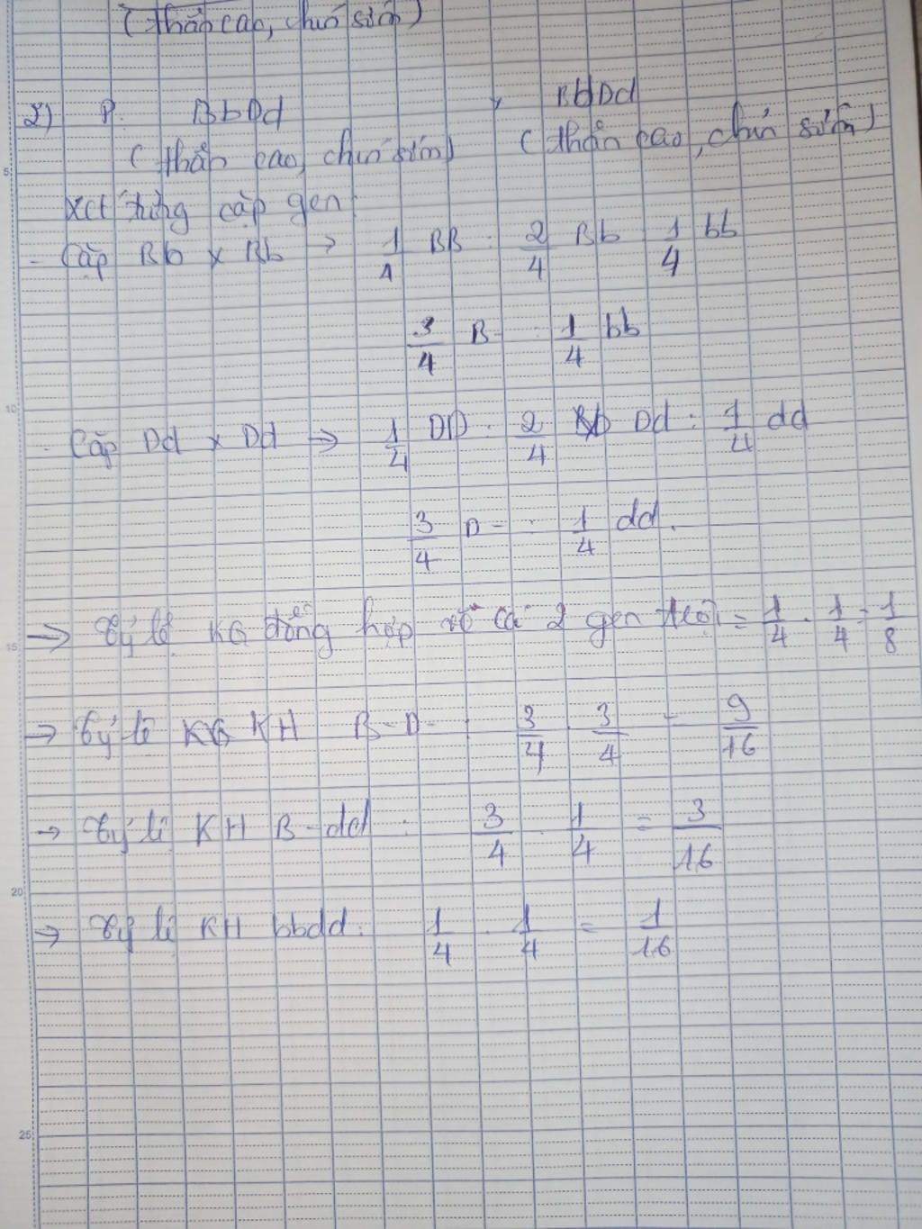 - Tỉ lệ kiểu gen đồng hợp về cả hai cặp gen trội (BBDD) ở đời F1 là:
