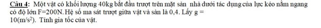 $a = \dfrac{{F - {F_{ms}}}}{m} = \dfrac{{F - mg\mu }}{m} = \dfrac{{200 - 40.10.0,4}}{{40}} = 1m/{s^2}$