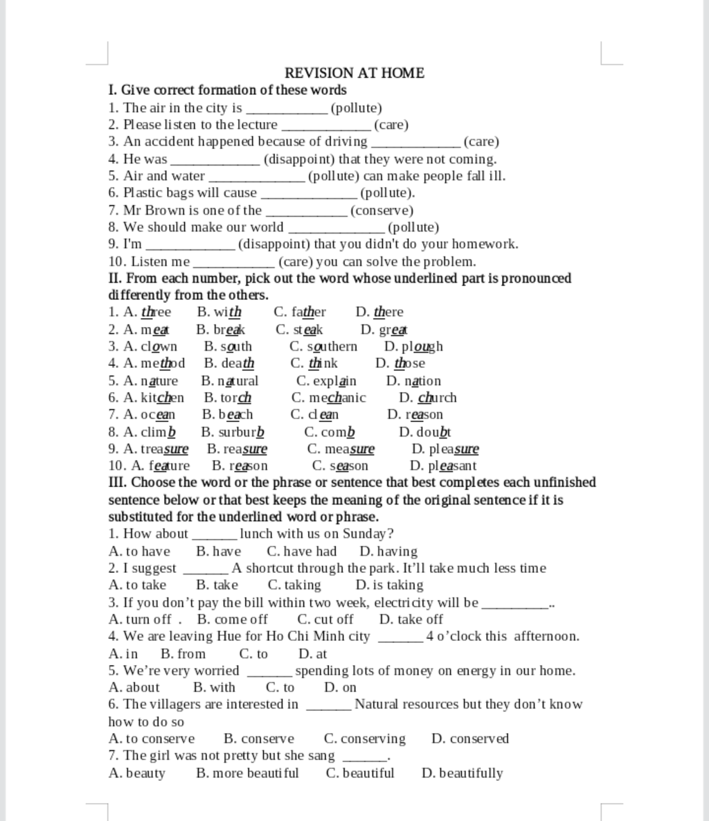 REVISION AT HOME I. Give correct formation of these words (pollute) (care) 1. The air in the city is 2. Please listen to the lecture 3. An accident happene