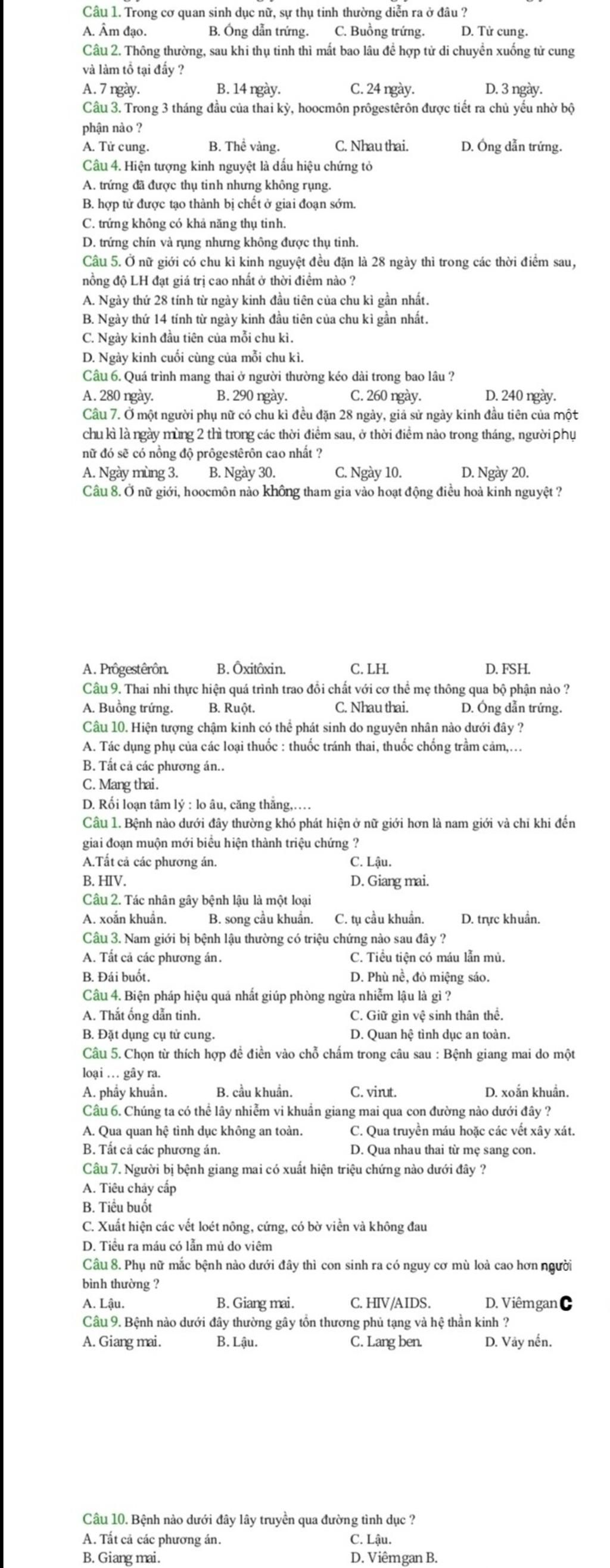 Câu 1. Trong cơ quan sinh dục nữ, sự thụ tinh thường diễn ra ở đâu ?