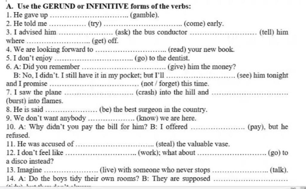 A. Use the GERUND or INFINITIVE forms of the verbs: 1. He gave up 2. He told me (gamble). (try) (come) early. 3. I advised him where. (tell) him (ask) the