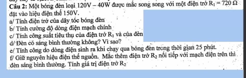 Câu 2: Một bóng đèn loại 120V - 40W được mắc song song với một điện trở Rị= 720 2 đặt vào hiệu điện thế 150V. al Tính điện trở của dây tóc bóng đèn b/ Tính