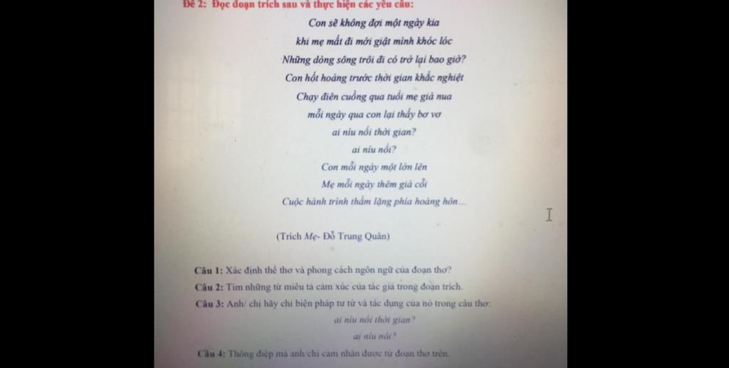 Câu 4. Thông điệp rút ra từ đoạn thơ trên: thời gian trôi rất nhanh, bởi vậy hãy luôn trân trọng người mẹ của mình. Chúng ta càng ngày càng lớn lên nhưng điều đó cũng đồng nghĩa với việc mẹ sẽ già đi. Hãy luôn sống vẹn tròn chữ hiếu để bản thân không hối tiếc.