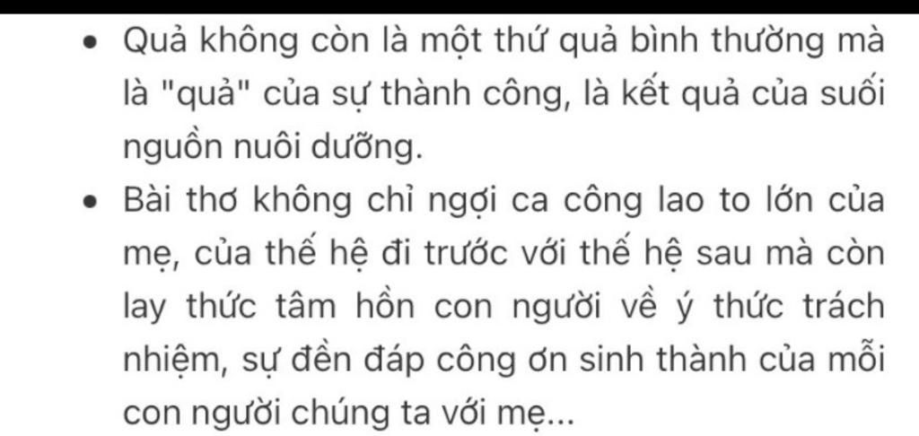 Ta thấy hình ảnh người mẹ hiện ra như một điển hình của tầng lớp nông dân chân chất, chịu thương chịu khó, chăm chỉ, tần tảo. Bài thơ không chỉ ca ngợi công lao vĩ đại của người mẹ, của thế hệ đi trước với thế hệ sau mà còn lay dậy tâm hồn con người về ý thức trách nhiệm, sự đền đáp công ơn sinh thành của mỗi con người chúng ta với mẹ.