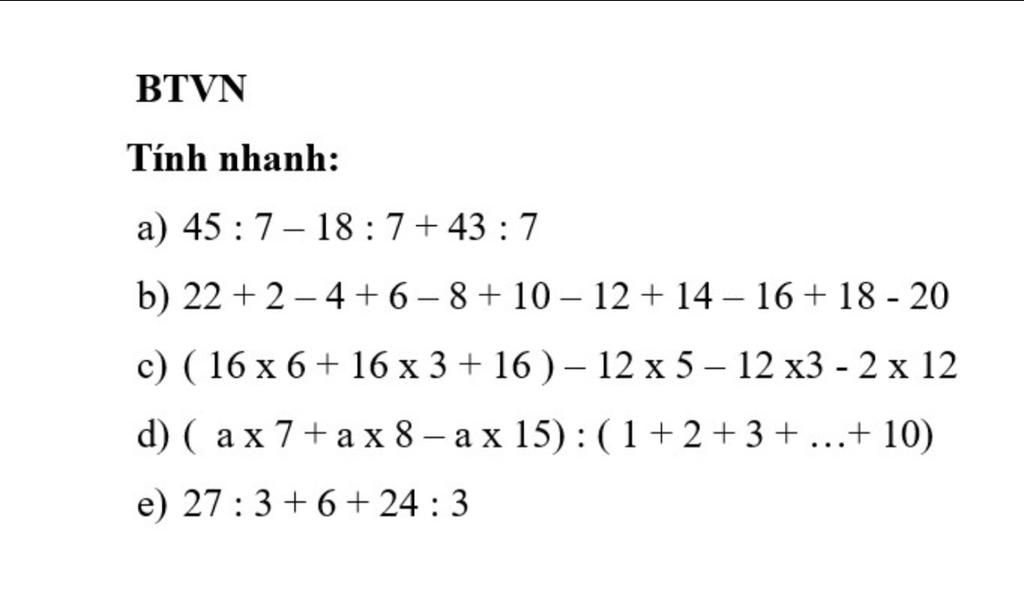`d)` `(` `a` x `7` `+` `a` x `8` `-` `a` x `15` `)` `:` `(` `1` `+` `2` `+` `3` `+` `...` `+` `10` `)` Có 10 số hạng.