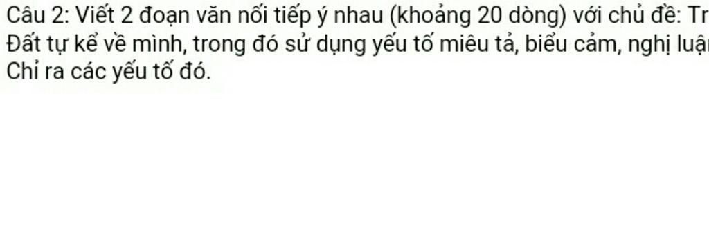 Câu 2: Viết 2 đoạn văn nối tiếp ý nhau (khoảng 20 dòng) với chủ đề: Tr Đất tự kể về mình, trong đó sử dụng yếu tố miêu tả, biểu cảm, nghị luậ Chỉ ra các yế