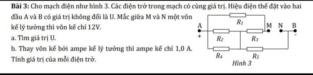 Ai giúp mình câu A với ạ. Đừng copy trên mạng mình đọc hết rồi ạ. Mình cảm ơnBài 3: Cho mạch điện như hình 3. Các điện trở trong mạch có cùng giá trị. Hiệu điệ