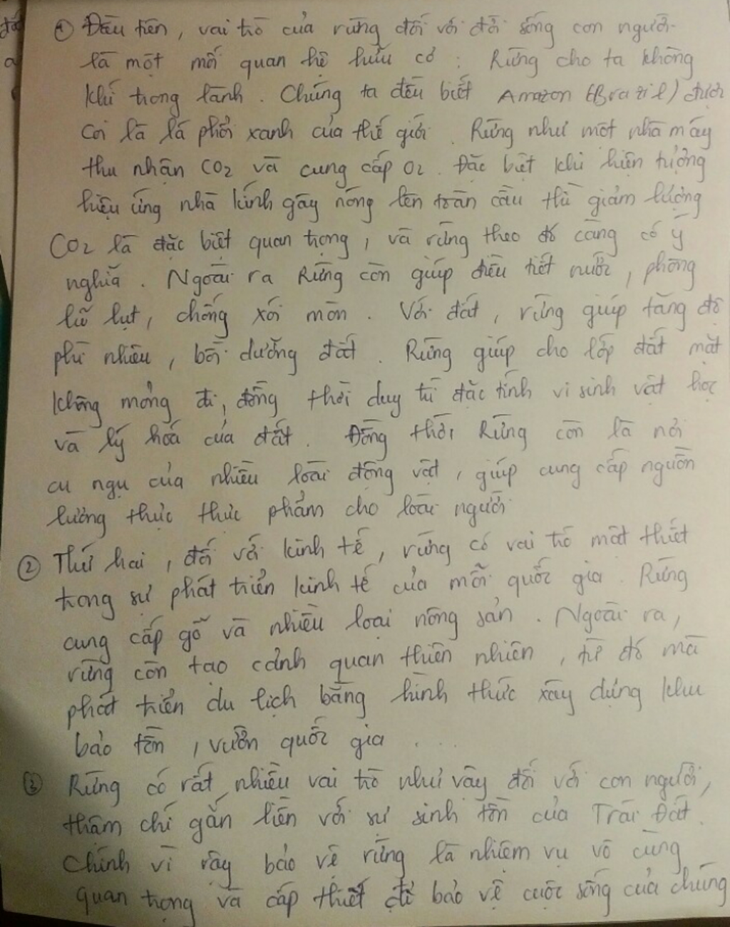Một trong số những thứ mà chúng ta cần và quan trọng nhất chính là nguồn ôxi. Vậy, liệu có ai biết rằng: ôxi từ đâu mà có ? Thì là từ rừng chứ đâu nữa ! Rừng là thứ cung cấp nguồn ôxi lớn nhất quả đất. Chúng ta thừa biết một điều, nếu thiếu ôxi con người sẽ chết. Vậy, có thể kết luận một điều thiếu rừng con người cũng không thể sống. Và không dừng lại ở đó, rừng còn cung cấp rất nhiều cho ta. Nào là: nguồn thức ăn, các loại gỗ quý ... và còn là nơi sinh sống cho những loài động vật hoang dã.