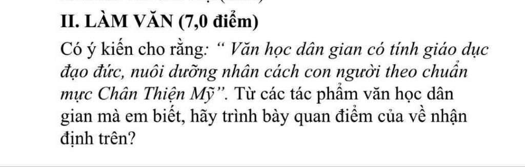 II. LÀM VĂN (7,0 điểm) Có ý kiến cho rằng: “ Văn học dân gian có tính giáo dục đạo đức, nuôi dưỡng nhân cách con người theo chuẩn mực Chân Thiện Mỹ". Từ cá