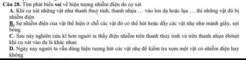 Câu 28. Tìm phát biểu sai về hiện tượng nhiem diện do co xát A. Khi cọ xát những vật như thanh thuỷ tinh, thanh nhựa .. vào len dạ hoặc lụa .. thì những vậ