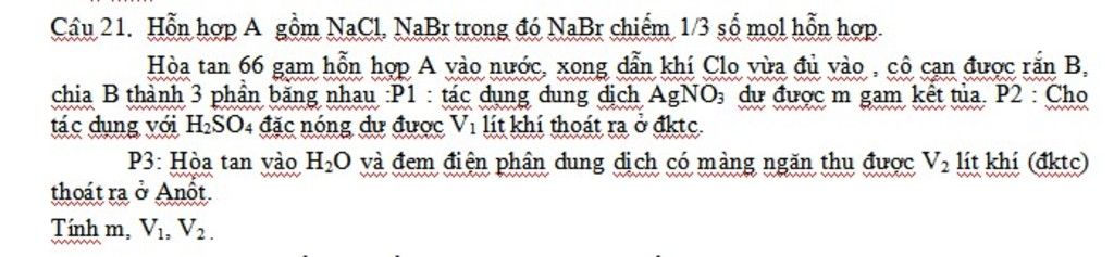 Spu thu đc 0,3 mol NaCl. Vậy rắn B gồm 0,9 mol NaCl. Mỗi phần có 0,3 mol NaCl.