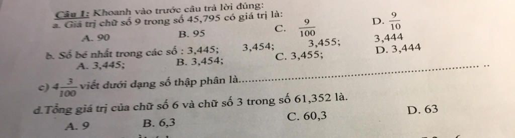 c) `4 3/100` viết dưới dạng số thập phân là: `4,03`
