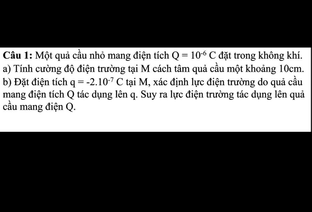 \[E = \frac{{k.\left| Q \right|}}{{{r^2}}} = \frac{{{{9.10}^9}{{.10}^{ - 6}}}}{{0,{1^2}}} = {9.10^5}V/m\]