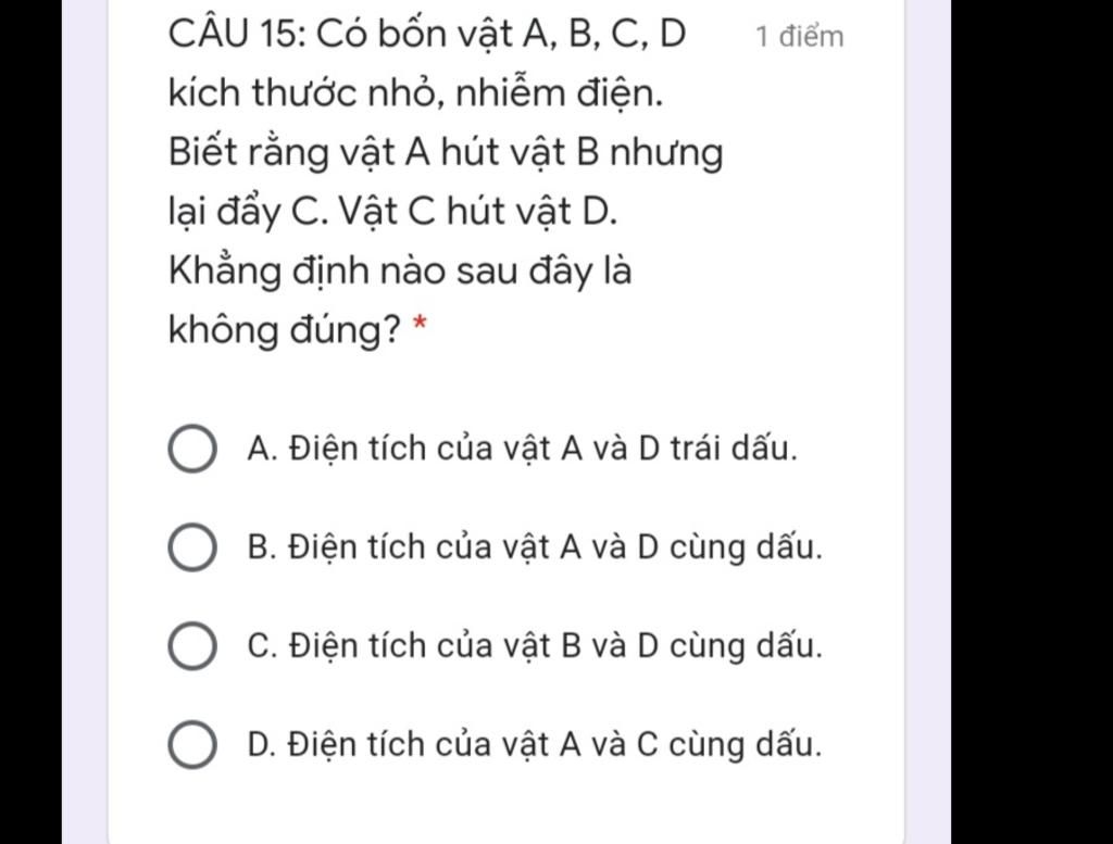 CÂU 15: Có bốn vật A, B, C, D kích thước nhỏ, nhiễm điện. Biết rằng vật A hút vật B nhưng lại đẩy C. Vật C hút vật D. Khẳng định nào sau đây là 1 điểm khôn