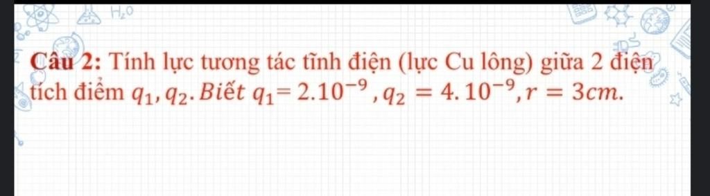 Cầu 2: Tính lực tương tác tĩnh điện (lực Cu lông) giữa 2 điện tích điểm q1, q2. Biết q,= 2.109,q2 = 4. 10–9,r = 3cm. %3D