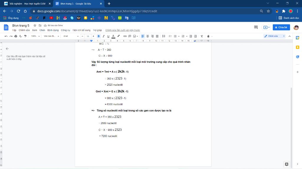 số lượng từng loại nucleotit mỗi loại môi trường cung cấp cho quá trình nhân đôi là