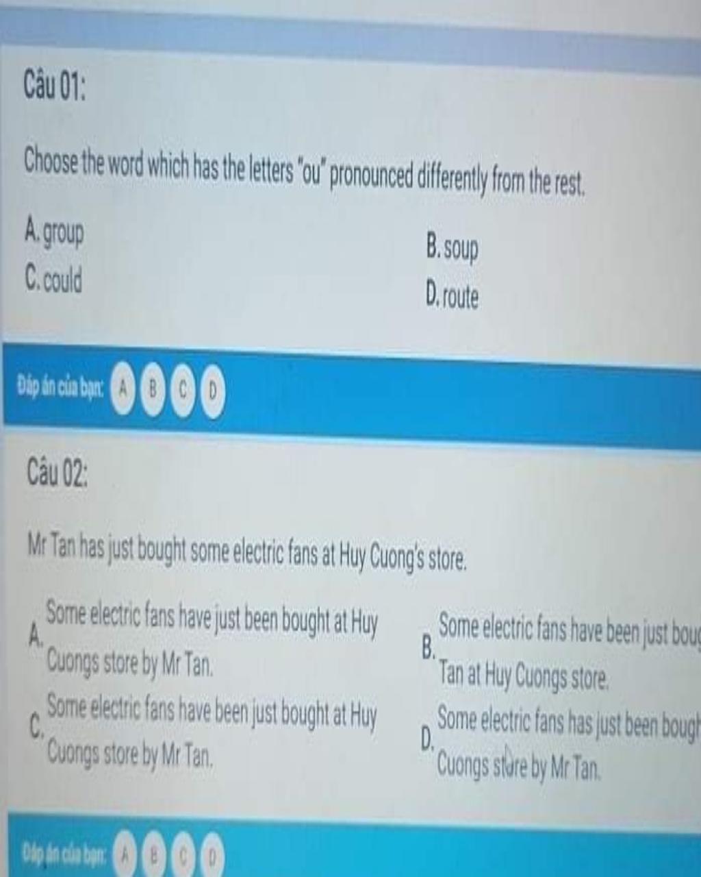 Câu 01: Choose the word which has the letters "ou' pronounced difrently from the rest. A.group B. soup C. could D. route Câu 02: Mr Tan has just bought som