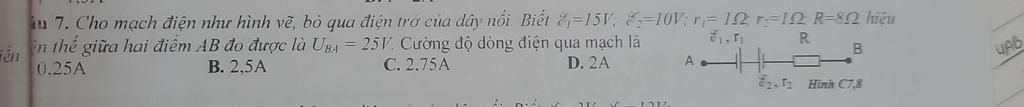 in 7. Cho mạch điện như hình vẽ, bỏ qua điện trở của dây nổi. Biết =15V; =10V;r= 12 r=10 R-82 hiệu n the giữa hai điểm AB đo được là URA = 25V. Cường dộ dò