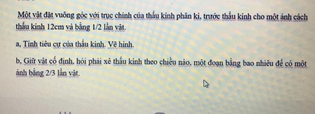 Một vật đặt vuông góc với trục chinh của thấu kinh phân kì, trước thấu kính cho một ảnh cách thấu kinh 12cm và bằng 1/2 lần vật. a, Tinh tiêu cu của thẩu k