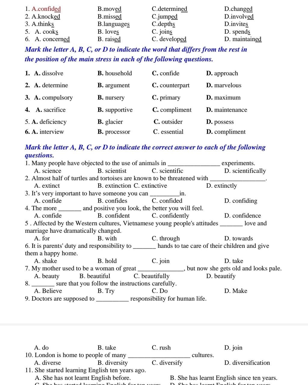1. A.confided 2. A.knocked 3. A.thinks 5. A. cooks 6. A. concerned B.moved B.missed B.languages B. loves B. raised C.determined C.jumped C.depths C. joins