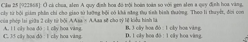 Một cây hoa vàng có KG aaaa, được tạo thành từ 2 giao tử aa. Vậy tỉ lệ cây hoa vàng là 1/6 * 1/6 = 1/36.