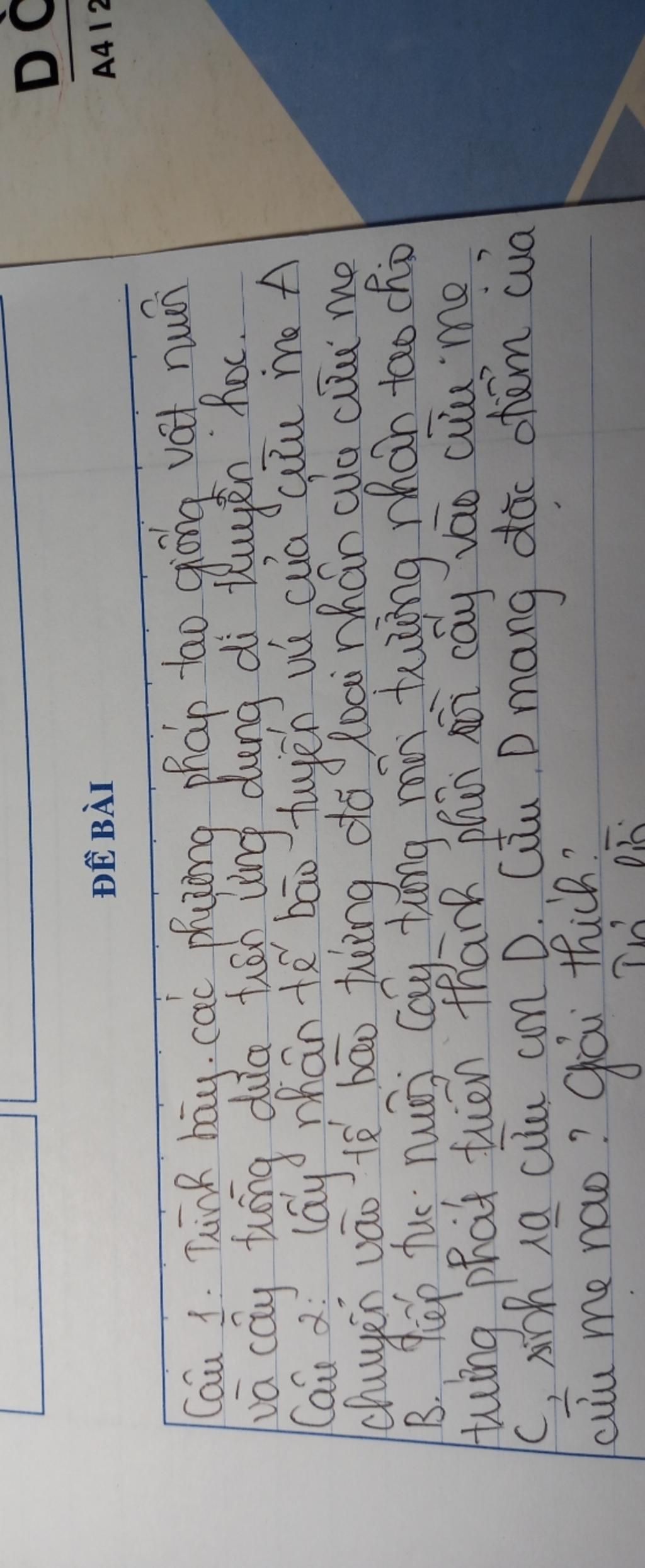 con cừu D sẽ mang đặc điểm của cừu mẹ A vì vật chất di truyền của cừu D là ADN trong nhân của tế bào cho nhân