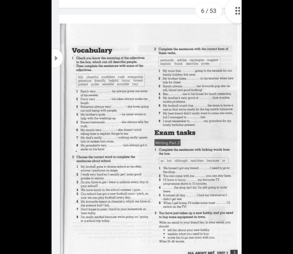 6/53 Vocabulary 3 Complete the sentences with the correct form of these verbs. 1 Check you know the meaning of the adjectives in the box, which can all des