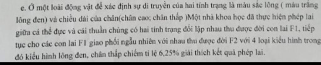 $F2$ có $4$ loại kiểu hình , lông đen chân thấp chiếm tỉ lệ $6,25=\frac{1}{16}=$ $\frac{1}{4}×\frac{1}{4}$