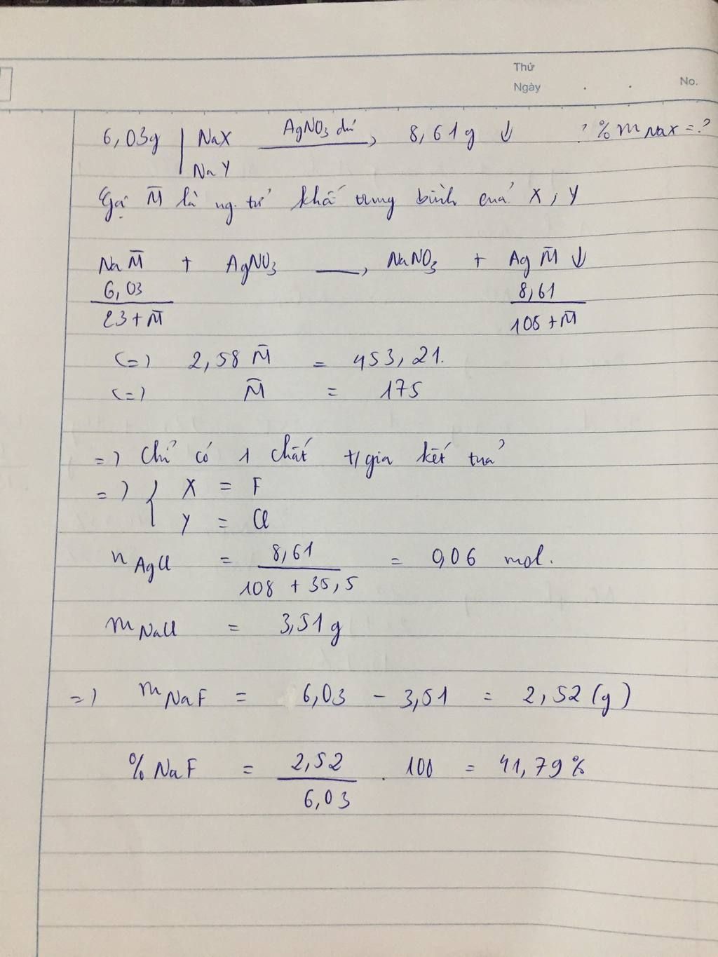 $\begin{gathered} {n_{NaZ}} = {n_{AgZ}} \to \frac{{6,03}}{{23 + Z}} = \frac{{8,61}}{{108 + Z}} \hfill \\ \,\,\,\,\,\,\,\,\,\,\,\,\,\,\,\,\,\,\,\,\,\,\,\,\,\,\,\,\,\,\,\,\,\,\,\,\,\,\,\,\,\,\,\,\,\,\,\,\,\,\,\,\,\,\,\,\,\,\,\,\,\, \to \,\,\,\,\,\,\,\,\,\,\,\,\,\,\,\,Z = 175,66\,\, > 127\,\,loại \hfill \\ \end{gathered} $