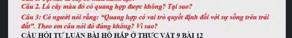 Câu 2 Những cây màu đỏ vẫn có nhóm sắc tố màu lục, nhưng bị che khuất bởi màu đỏ của nhóm sắc tố dịch bào là antôxianin và carôtenôit. Do vậy, những cây này vẫn quang hợp bình thường, nhưng cường độ quang hợp thường không cao