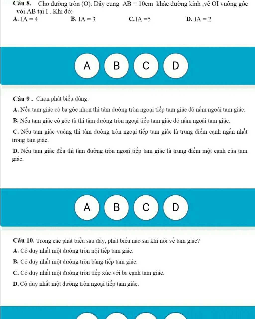 Câu 8. với AB tại I. Khi đó: Cho đường tròn (0). Dây cung AB = 10cm khác đường kính ,vẽ OI vuông góc A. IA = 4 B. IA = 3 C. [A =5 D. IA = 2 A В C Câu 9. Ch