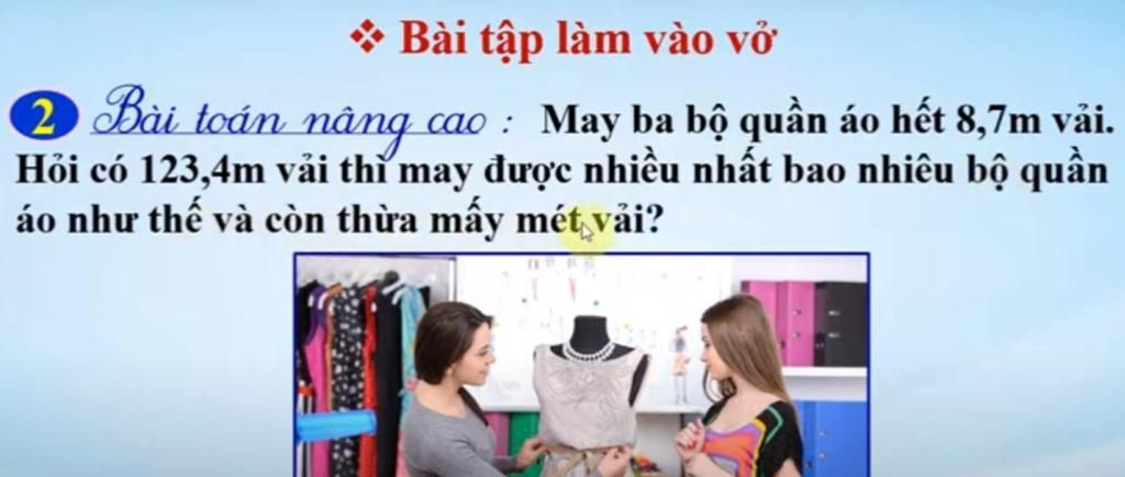 $123,4$ m vải may được số bộ quần áo và còn thừa số m vải là :