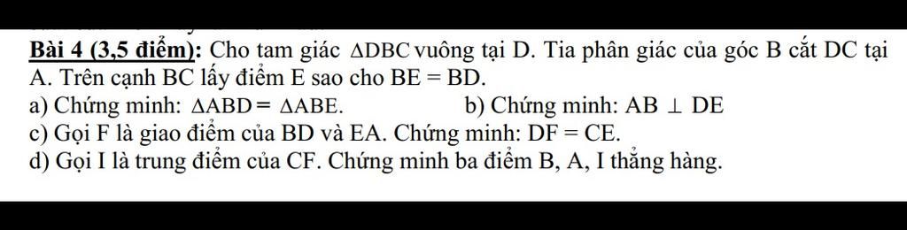cắt DC tại Bài 4 (3,5 điểm): Cho tam giác ADBC vuông tại D. Tia phân giác của góc A. Trên cạnh BC lấy điểm E sao cho BE = BD. a) Chứng minh: AABD= AABE. c)