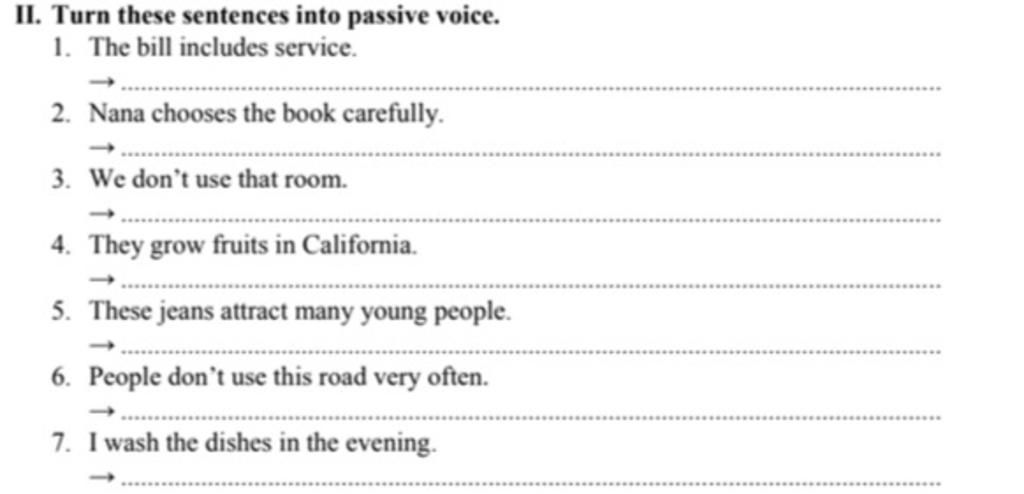 + Nếu chủ ngữ trong câu chủ động là: I, you, we, they, he, she thì có thể bỏ đi trong câu bị động nếu ta không muốn đề cập tới chủ thể gây ra hành động