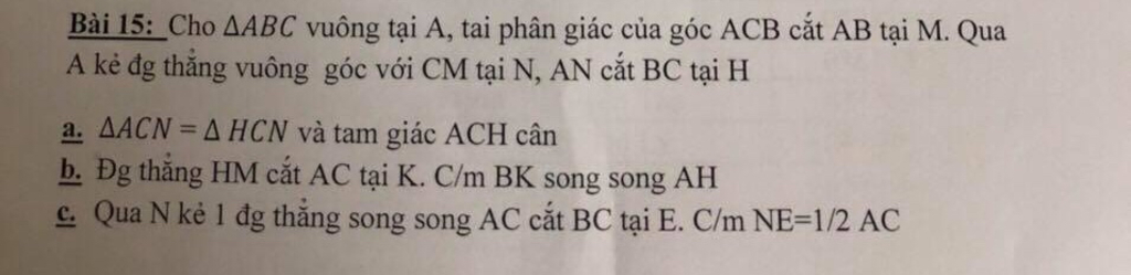 Cho tam giác ABC vuông tại A, tại phân giác của góc ACB cắt AB tại M. Qua A kẻ đường thẳng vuông góc với CM tại N, AN cắt BC tại H. a. Tam giác ACN = tam giác